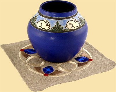 The Blue Diamond Table Top Linen is a perfect doily for a smaller vase or pottery piece. With classic craftsman colors, this compliments most Arts & Crafts copper and art pottery pieces. It is pictured with a Paul Revere series rabbit vase by Door Pottery. This natural linen piece measures 10 1/2" across.