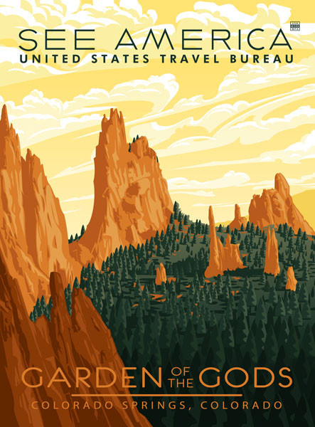 Garden of the Gods United States Travel Bureau poster is our original design in the style of the orignal Works Project Administration (WPA)Federal Art Project as an addition to the original See America series. This design represents the scenic view of the Garden of the Gods park at the base of the Rocky Mountains in Colorado Springs, Colorado just a few miles North of Pike's Peak. Heavy stock paper was used to produce a non-reflective matte finish for a look and feel of the original silk screened posters. Please check our other items for a high quality frame for this poster.