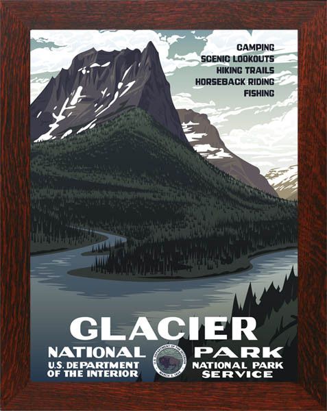 The Glacier National Park WPA-Style poster is an original design based on the Works Project Administration (WPA)Federal Art Project vintage poster style. Heavy stock paper was used to produce a non-reflective matte finish for a look and feel of the original silk screened posters. Please check our other items for a high quality frame for this poster. The poster is in a quarter sawn white oak frame made of hand selected wood by our friends at Dard Hunter Studios.