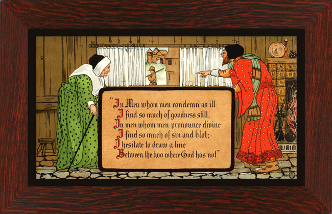 This print features an elderly couple and featuring the poem Songs of the Sierras (1871) by Joaquin Miller?, In Men whom men condemn as ill I find so much of goodness still, In Men whom men pronounce divine I find so much of sin and blot; I hesitate to draw a line Between the two where God has not. Its a beautiful Arts & Crafts print that would be perfect in any home or in a man cave. Print measures 16.25 inches wide by 9.25 inches tall. Framed with quarter-sawn oak frame produced by Dard Hunter Studios.