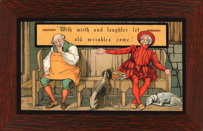 This print features two gentlemen with dogs enjoying themselves with the text, With mirth and laughter let old wrinkles come. Its a beautiful Arts & Crafts print that would be perfect in any home. Print measures 16.25 inches wide by 9.25 inches tall. Print measures 16.25 inches wide by 9.25 inches tall. Framed with quarter-sawn oak frame produced by Dard Hunter Studios.